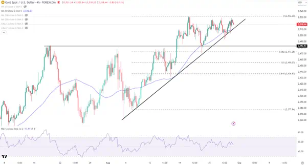 若PCE数据高于预期或继续提振美元并令黄金承压,下方关注2500/10一带的初步支撑,这里有着趋势线和关键均线,其次是2470/80区域。而低于预期的通胀数据显然会增加9月降息50bp的概率,从而帮助黄金继续冲高,目前离历史高点仅有不到1%的距离。