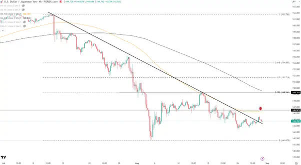 多头已经初步走出了趋势线的压制,接下去首先需要攻克的是100MA所在的146.50一线,其次是200MA和38.2%回调位149.34,在真正突破之前汇价仍然受到较强的下行压力。