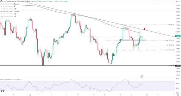 均线和趋势线所在的76.80是显而易见的阻力,无法成功突破意味着继续震荡下行。下方的75.20是首要支撑参考,跌破或测试本周低点73.80。更下方的71.45双底结构可以限制油价的大幅下跌。